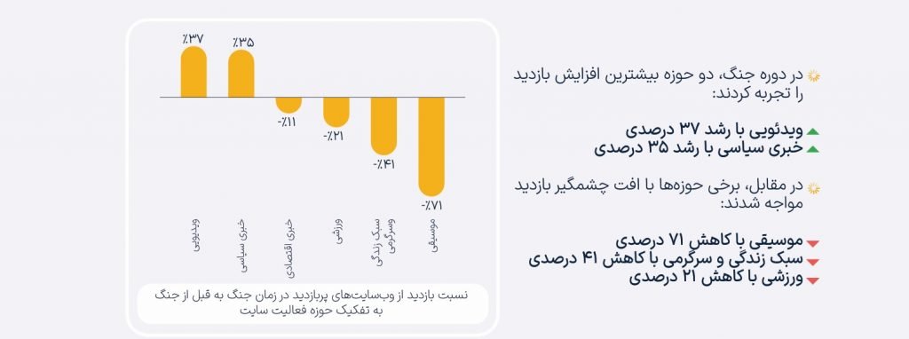 در بررسی بازدید وبسایتها بر اساس حوزه فعالیت، تغییرات رفتاری کاربران بهوضوح قابل مشاهده است. در دوره جنگ، دو حوزه ویدئویی و خبری سیاسی بیشترین افزایش بازدید را به ترتیب با رشد ۳۷ درصدی و ۳۵ درصدی تجربه کردند. در مقابل، حوزههای موسیقی، سبک زندگی و سرگرمی و ورزشی به ترتیب با کاهش ۷۱ درصدی، ۴۱ درصدی و ۲۱ درصدی، بیشترین میزان افت را شاهد بودند.