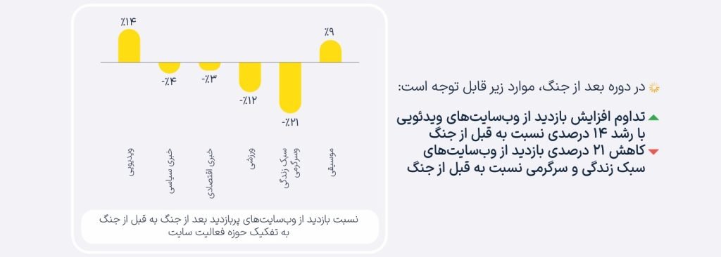 پس از پایان جنگ، روند بازدید وبسایتها به تدریج بازیابی شد، اما برخی حوزهها همچنان با تغییرات قابلتوجه همراه بودند. برای مثال، بازدید از وبسایتهای ویدئویی با رشد ۱۴ درصدی نسبت به قبل از جنگ ادامه یافت، در حالی که بازدید از وبسایتهای سبک زندگی و سرگرمی همچنان ۲۱ درصد کمتر از دوره قبل از جنگ بود.