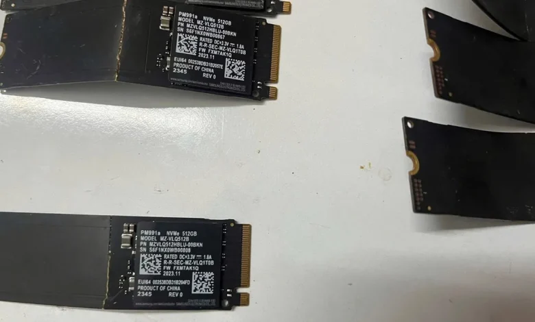 بررسی عکسها نشان میدهد که این SSDها همگی از نوع PM991a ساخت شرکت سامسونگ و با ظرفیت ۵۱۲ گیگابایت و فرم فاکتور M.2 2280 هستند. این قطعات نسخههای OEM هستند و بهراحتی از فروشگاههای بزرگ ایالات متحده قابل خریداری نیستند. اما با بررسی سایتهایی مثل eBay میتوان به نمونههایی با قیمت ۶۰ دلار نیز رسید. پس اگر تمام این SSDهای خمیده و خراب دور ریخته شوند، خسارت کل به حدود ۳۰۰۰ دلار میرسد.