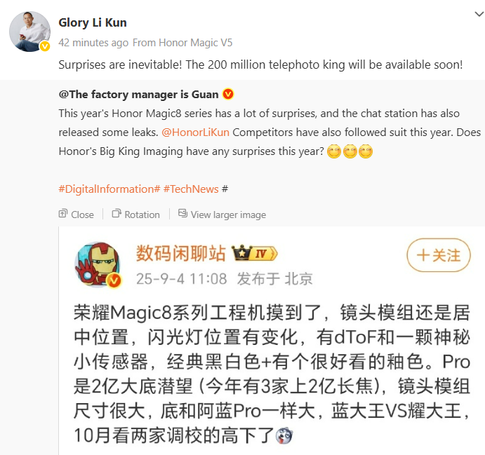 بر اساس اظهارات لی کون، دوربین تلهفوتوی ۲۰۰ مگاپیکسلی آنر بهزودی در دسترس قرار خواهد گرفت. این پست در شبکه اجتماعی ویبو درست پس از آن منتشر شد که افشاگر معتبری به نم دیجیتال چت استیشن جزئیات جدیدی از خانواده آنر مجیک ۸ منتشر کرده بود. این سری انتظار میرود در ماه اکتبر (مهر) در بازار چین رونمایی شود.