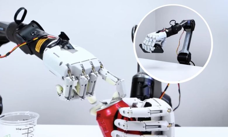 این دست رباتیک دیده میشود که یک پیچ M5 را میگیرد، یک آیفون را برمیدارد و با دقت یک قوطی نوشابه را باز میکند.