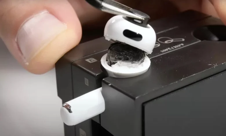 همانطور که انتظار میرفت، بهدلیل ابعاد بسیار کوچک، دسترسی به اجزای داخلی هدفون کار سادهای نیست و اساساً اپل آن را برای باز شدن طراحی نکرده است. بااینحال، برداشتن باتری در مقایسه با نسلهای قبل کمی آسانتر شده، اما همچنان معیار قابلتوجهی به حساب نمیآید.