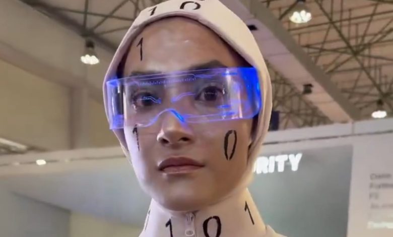 در تصویر منتشرشده از این رویداد، فردی با لباس سفید که روی آن اعداد دودویی (۰ و ۱) چاپ شده، به همراه شیلد شفاف صورت و دستکشهای مشکی دیده میشود. این ظاهر بهگونهای طراحی شده که تداعیکننده یک ربات انساننما باشد. در پسزمینه تصویر، غرفهای با عنوان «SECURITY» و تجهیزات نمایشگاهی قابل مشاهده است.